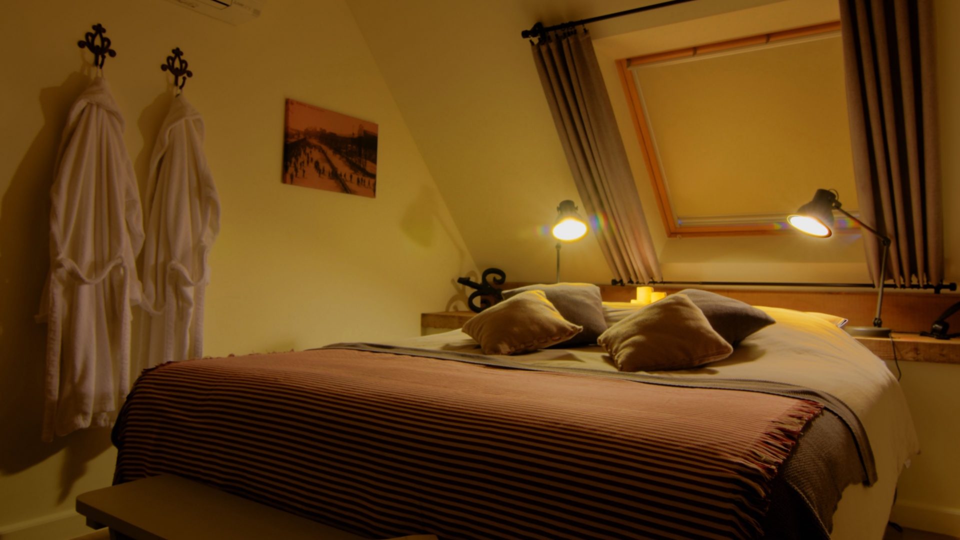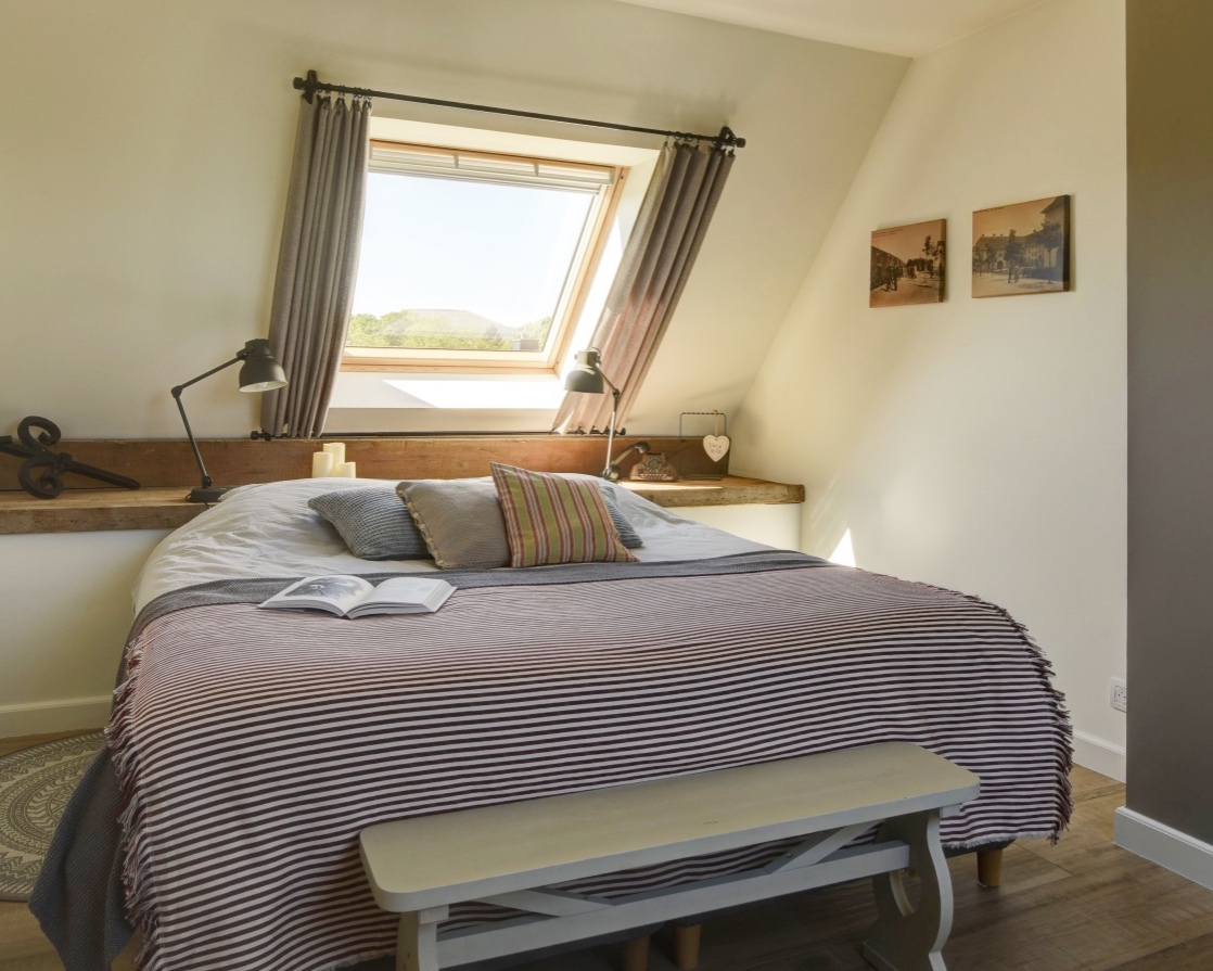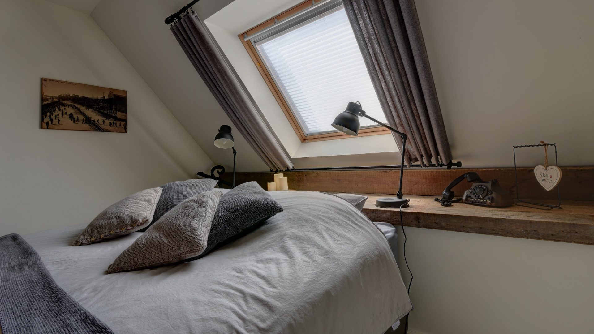 Het houten hoofdeinde is gemaakt van de bijna 100 jaar oude vloerbalken, die na het vernieuwen van de vloeren tijdens de renovatie zijn bewaard.